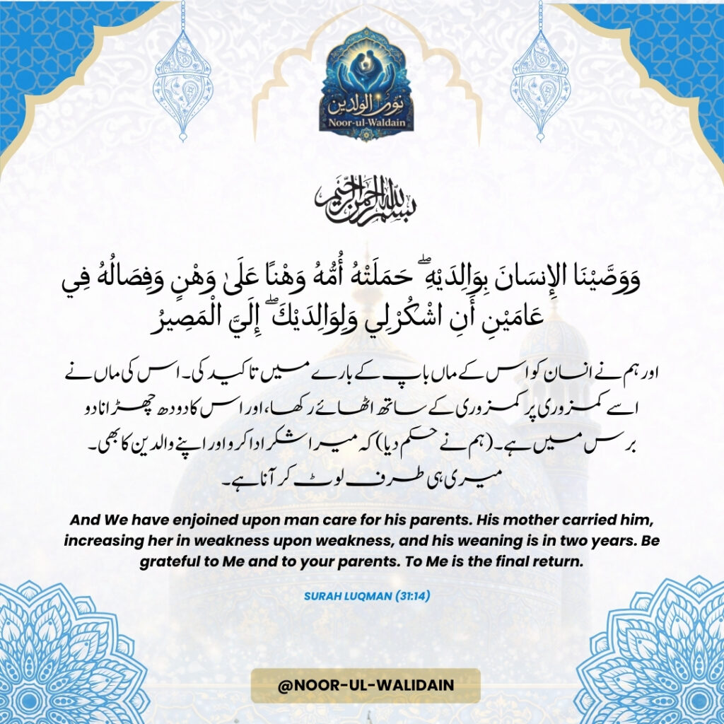 1- Is ayat mein Allah Ta’ala ne walidain ki qadr, izzat aur unke huqooq ko bohat wazeh aur buland andaz mein bayan kiya hai.2- Khaas taur par maa ki qurbaniyon ka zikr hai jo...